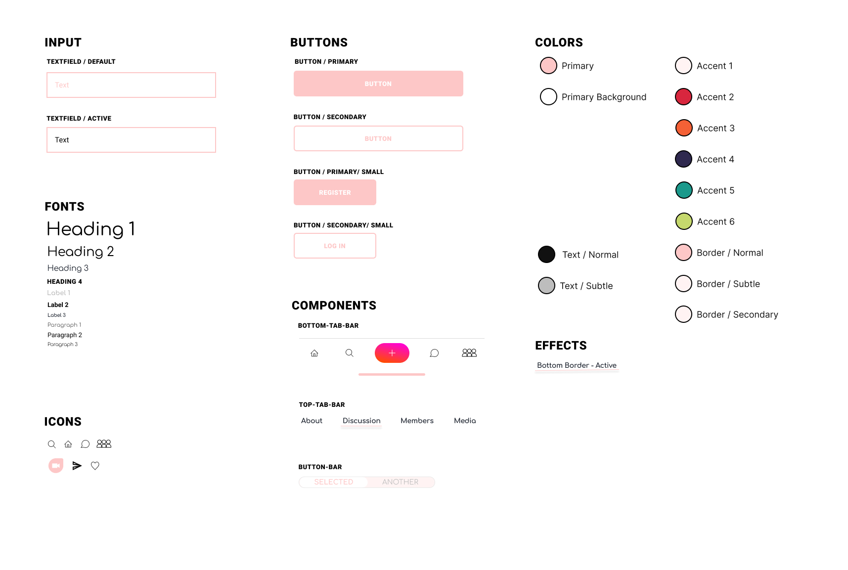 The research team provided us with the core bran values: community, sisterhood, femininity, and strength. My co-designer and I met with te researchers and community leaders to identify which components of the existing design system were important to keep. The color palette resonated strongly with the users, so we stuck to the original colors. I proposed a new design system to simplify our UI to evoke a sense of familiarity and femininity while still holding onto strength through the bold icons.